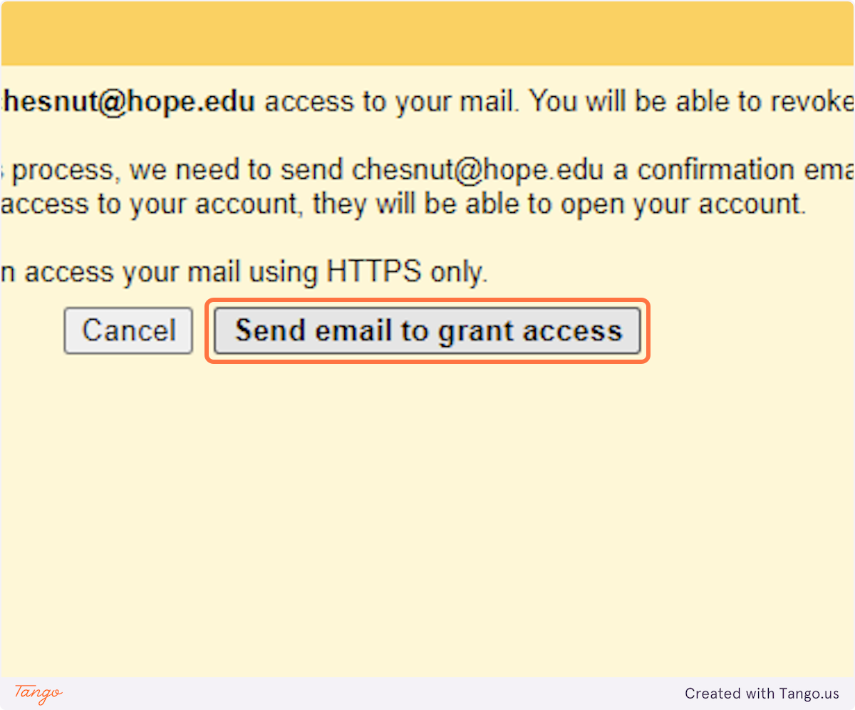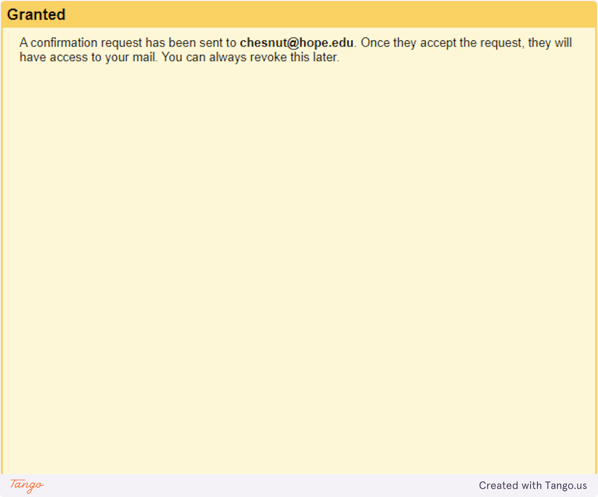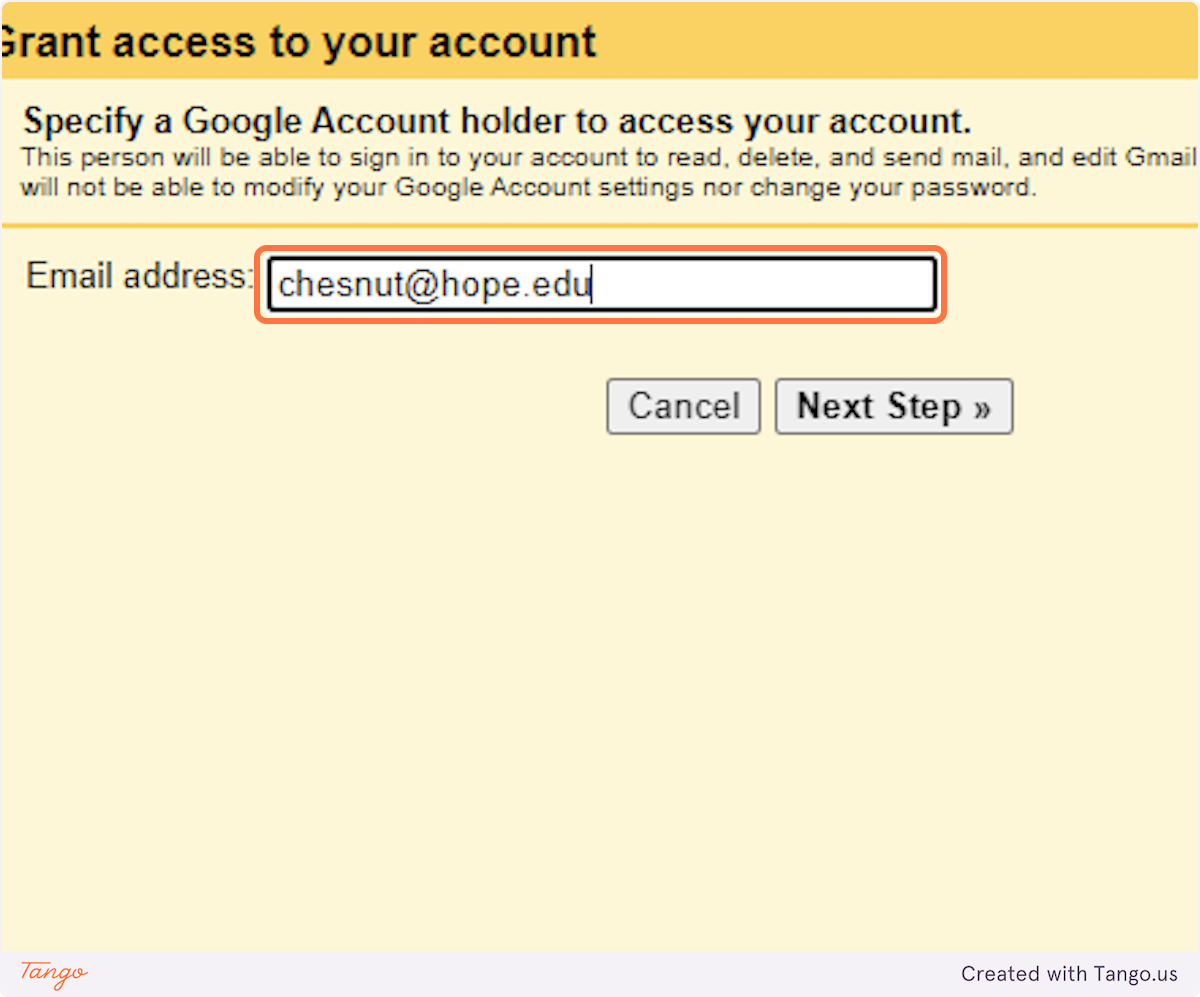Click Next Step, then Send email to grant access. The person will get an email with a link to accept the delegation.