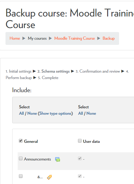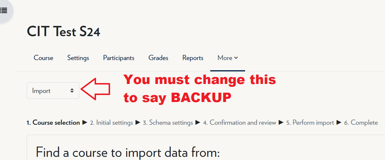 - Click on “More “. Select “Course reuse” and then select “Backup”