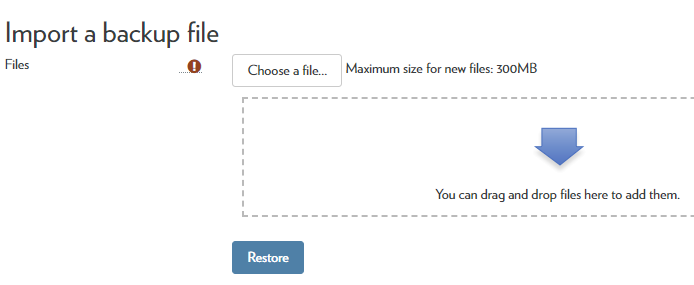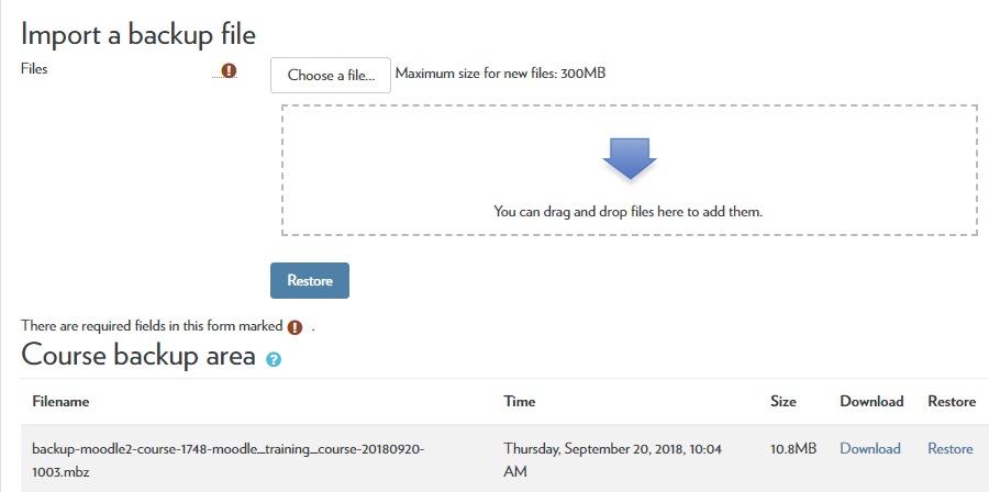 - In the “Import a backup file” section, drag the backup file into the drag and drop box (or select “Choose a file”). The file that was downloaded from your other course should be in your “downloads” folder. Click the Restore button.