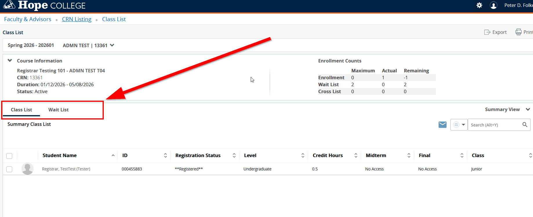 5. Now you will be in that specific course where you have the option to choose from seeing the enrolled list or the wait list.